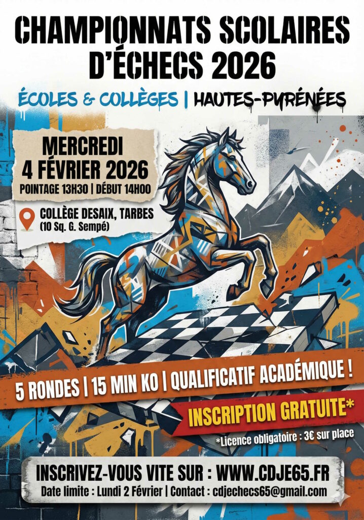 En vous inscrivant, vous vous engagez à prendre une licence de la Fédération Française d’Echecs d’une valeur de 3 euros que vous pourrez payer sur place le jour du tournoi (prévoir l’appoint). Tous les participants jouent au moins 5 parties.